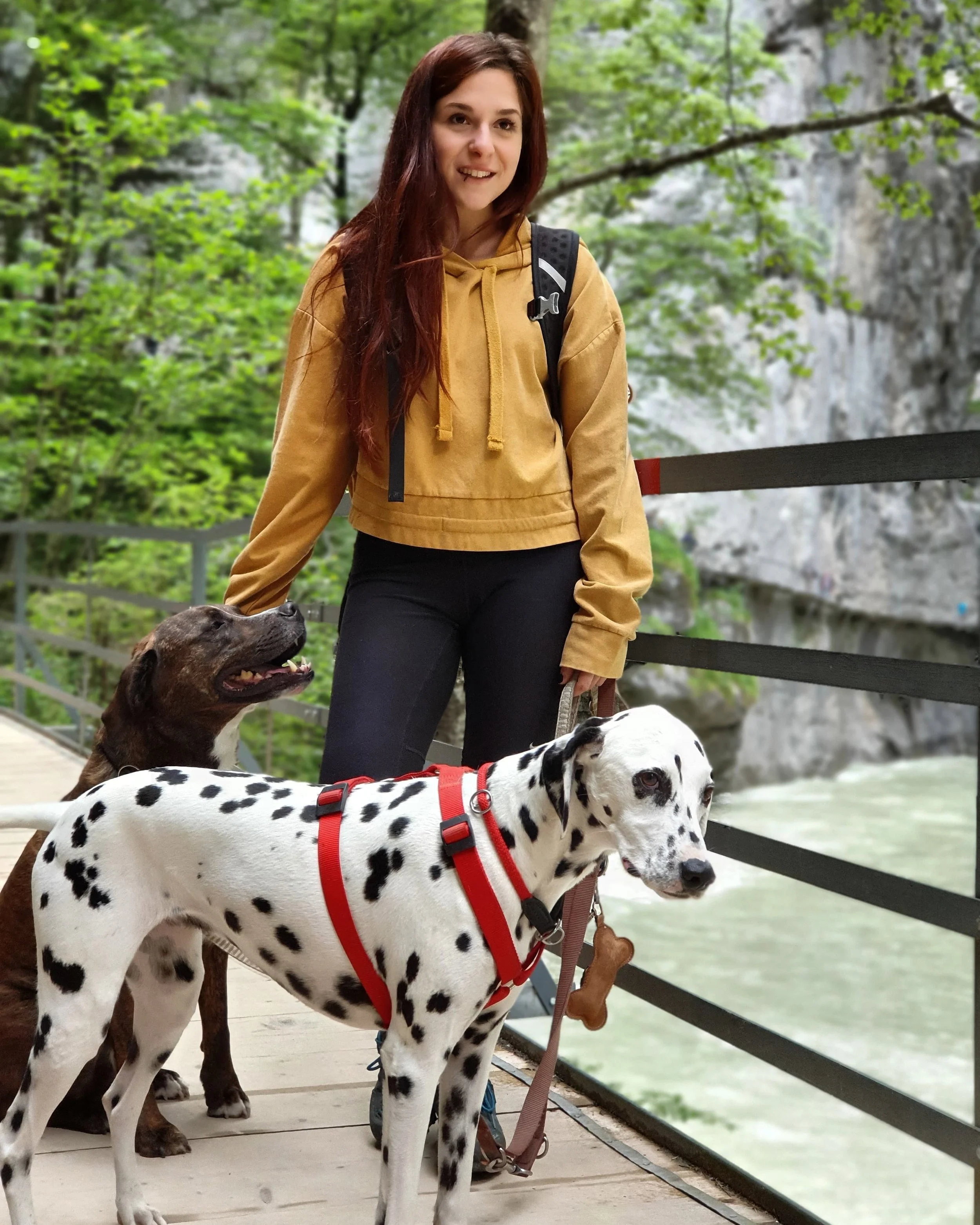 Eine junge Frau mit roten Haaren, in einer braunen Jacke, steht auf einer Brücke im Wald mit zwei Dalmatiner-Hunden, umgeben von grünen Bäumen und Felsen, mit einem Fluss im Hintergrund.